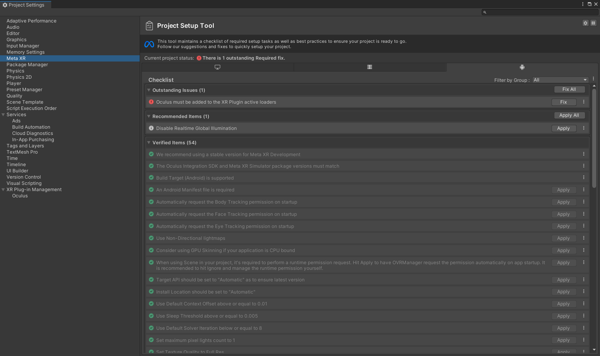 - Fix any remaining project configuration issues. Open the Project Settings window and select the "Meta XR" tab. Address any issues that show up in the list here by hitting the Fix button. If you're unsure, we generally recommend hitting Fix All.